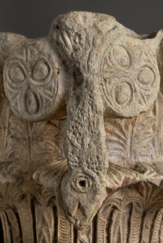 Chapiteau composite à anses, décoré de feuilles d'acanthes, de motifs géométriques abstraits et de poissons. Calcaire (pierre de Saintonge ?). 47,5x40x38 cm. Achat 2018. 7e - 8e siècle. Restauration 2020. Face A, détail du poisson de gauche.