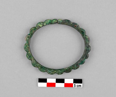 MAN 91868.009. Bracelet à godrons ouvert, en alliage à base de cuivre, provenant du site des Pièces de la Cave à Tavers (Loiret). P. : 56,5 gr. ; D. externe max. : 7,4 cm. ; D. interne min. : 5,1 cm. VI s. avant J.-C.