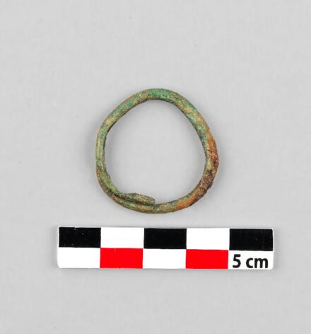 MAN 91868.033. Anneau ouvert aplati, en alliage à base de cuivre, provenant du site des Pièces de la Cave à Tavers (Loiret). P. : 3,3 gr. ; L. : 3,1 cm. ; l. : 3 cm. VI s. avant J.-C.