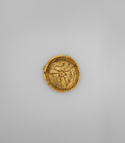 Bossette en or niellé, provient de Biozat (Allier). l. : 0,02 m. ; H. : 0,07 m. Époque mérovingienne, VIIe siècle après J.-C. Ancienne collection du Dr Vannaire à Gannat.